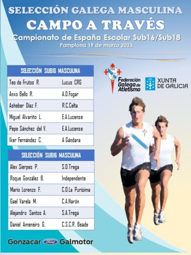 Anxo Bello Rodríguez da AD.Fogar de Carballo e Oleiros, ven de ser convocado pola Federación Galega de Atletismo para tomar parte no Campionato de España de Campo a Través Escolar sub16 e sub18 a celebrar o vindeiro domingo día 19 de marzo en Pamplona. Na categoría masculina sub18 ademáis de Anxo Bello o combinado galego estará representado por Teo de Frutos, Asheber Díaz, Miguel Alvariño, Pepe Sánchez del Valle e Iker Fernández, un grupo con moitísimo talento.