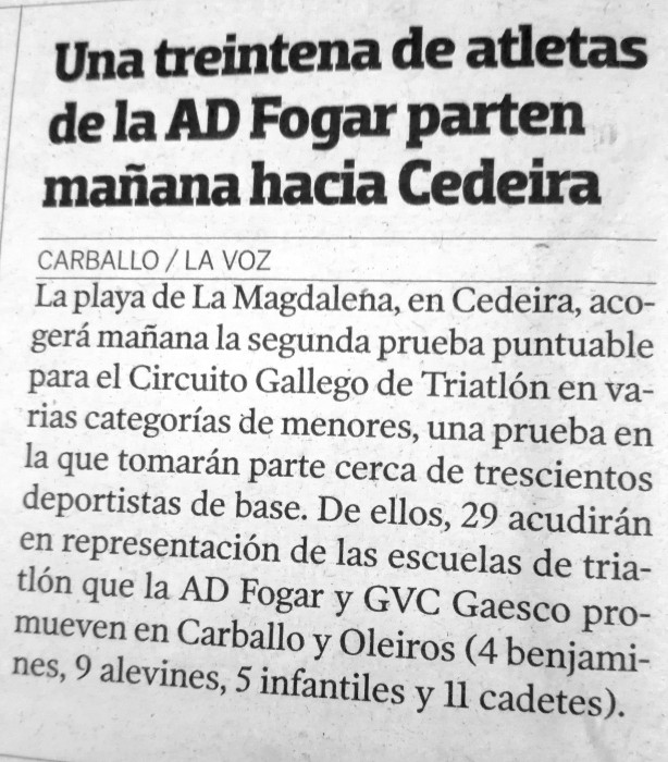 El próximo domingo día 27 de mayo de 2018, la Playa de La Magdalena de la localidad de Cedeira acogerá la 2ª prueba puntuable para el Circuito Gallego de Triatlón en Categoría de Menores, prueba que contará con el concurso de 273 triatletas de base, de los que 29 representarán a las Escuelas de Triatlón que la AD.Fogar y GVC Gaesco promueven en Carballo y Oleiros. Abrirán competición nuestros 4 triatletas benjamines que tomarán la salida a las 14:45hs, acto seguido y hacia las 15:15hs harán lo propio 9 de nuestros alevines, sobre las 16.15hs será el turno para nuestros 5 infantiles y hacia las 17:00hs cerrarán consurso 11 de los cadetes que pondremos en liza. Para ampliar la información sobre esta segunda prueba puntuable para el Circuito Gallego de Triatlón en Categorías Menores os podéis dirigir al enlace: https://www.rockthesport.com/es/evento/tratlondemenoresdecedeira2018; además en el archivo adjunto a esta noticia podéis consultar también nuestra propia inscripción.