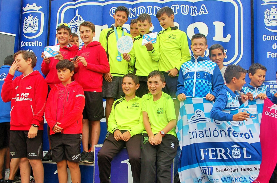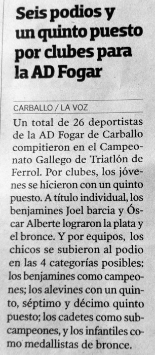 El pasado sábado día 21 de julio de 2018, la localidad de Ferrol acogía el Campeonato Gallego de Triatlón en Categoría de Menores (benjamines, alevines, infantiles y cadetes) que contaba con el concurso de 26 jóvenes triatletas de las Ecuelas de Base que la AD.Fogar y GVC Gaesco promueven en Carballo y Oleiros. En la cita autonómica nuestros jóvenes triatletas se hacían con una más que meritoria quinta plaza conjunta por clubs tras sumar 531 puntos y a pesar de competir con tan solo 3 chicas. A título individual hemos de destacar la plata y el bronce conseguidos por los benjamines Joel Barcia y Oscar Alberte respectivamente. En cuanto a la clasificación por equipos se refiere, nuestros chicos cuajaban un formidable concurso subiendo al pódium en las 4 categorías posibles, los benjamines como Campeones Gallegos con J.Barcia 2º, O.Alberte 3º y P.Rivas 8º; los alevines con M.Souto 5º, H.Souto 7º y A.Sancho 15º y los cadetes con D.Sancho 5º, A.Prieto 10º y A.Elizalde 15º como Subcampeones; y los infantiles como medallistas de bronce con S.Soto 8º, R.Otero 12º y G.Nuñez 33º. Además nuestras 3 chicas, M.González como 11ª infantil, S.Alberte como 14ª alevín y A.Otero como 20ª cadete, sumaban puntos muy valiosos para la clasificación general por clubs. Los resultados de este Campeonato Gallego de Triatlón en Categorías Menores pueden consultarse en el apartado de descargas escuela de esta misma web.