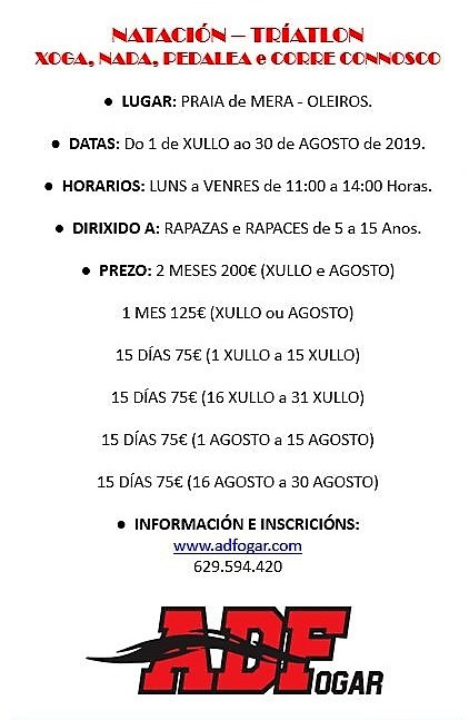 Desde a nosa sede en Oleiros facemos saber que estamos a ultimar os preparativos do MERA TRI CAMP 2019 que ano tras ano vimos organizando na Praia de Mera coa colaboración do Concello de Oleiros, a Deputación de A Coruña, O Serán e Grupo Breogán Motor. Como vén sendo habitual, abrimos xa un primeiro prazo de inscrición dirixido aos nosos asociados, que poden confirmar a súa participación ata o día 5 de maio de 2019. A partir desa data e segundo a dispoñibilidade de prazas, abriremos unha segunda quenda de inscrición para todos aqueles non afiliados interesados en participar das nosas actividades estivais. O campamento desenvolverase de luns a venres durante os meses de xullo e agosto, en horario matinal de 11 a 14 horas. No mesmo poderán tomar parte rapaces e rapazas de idades comprendidas entre os 5 e os 15 anos co obxectivo de pasar un verán divertido e dinámico baseado nas actividades básicas e os valores propios do tríatlon, é dicir, a natación en augas abertas, o ciclismo e a carreira a pé. O privilexiado da contorna e a organización e control das actividades por parte dos nosos adestradores e monitores veñen sendo nos últimos anos unha garantía de éxito. Achegámosvos a esta nova a información xeral. Podedes confirmar a vosa inscrición en liña picando AQUÍ e seguindo as instruccións do formulario.