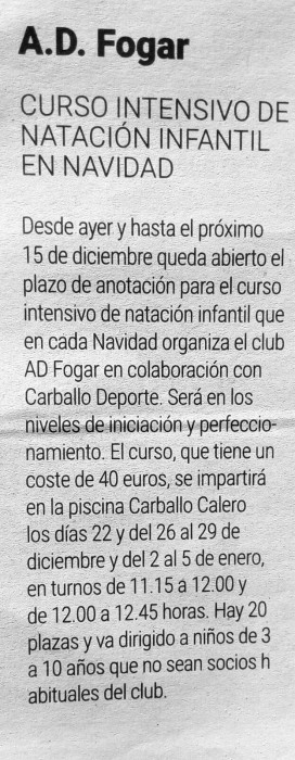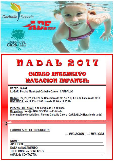 Desde hoy día 2 de noviembre y hasta el próximo día 15 de diciembre de 2017, queda abierto el plazo de inscripción al ya tradicional Curso Intensivo de Natación Infantil de Navidad que un año más organizamos desde la AD.Fogar en colaboración con Carballo Deporte en niveles de iniciación y perfeccionamiento. El curso que tiene un coste de 40€ se impartirá en la Piscina Municipal Carballo Calero de Carballo los días 22, 26, 27, 28 y 29 de diciembre de 2017 y 2, 3, 4 y 5 de enero de 2018, en turnos de 11:15 a 12:00 horas y de 12:00 a 12:45 horas y contará con un total de 40 plazas, 20 por turno, para niñ@s de 3 a 10 años que no sean socios habituales del club. Desde la AD.Fogar pretendemos así dar cabida a gran parte de los 100 niñ@s con los que contamos en Lista de Espera (http://www.adfogar.com/escuela/lista-de-espera) para iniciarse en la práctica de la natación con nosotros. Información e inscricipciones en la misma Piscina Municipal de la Calle Carballo Calero en horario de tarde entre las 17:00 y las 20:00hs. No esperes más, ¡¡ MÓJATE CON NOSOTROS EN NAVIDAD !!