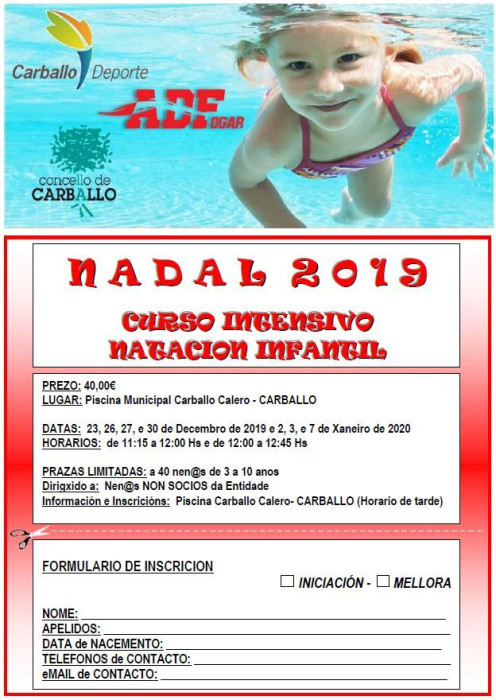 Desde mañán día 18 de novembro e ata o próximo día 21 de decembro de 2019, queda aberto o prazo de inscrición ao xa tradicional Curso Intensivo de Natación Infantil de Nadal que un ano máis organizamos desde a AD.Fogar en colaboración co Concello de Carballo e Carballo Deporte en niveis de iniciación e mellora. O curso que ten un custo de 40€ impartirase na Piscina Municipal Carballo Calero de Carballo os días 23, 26, 27 e 30 de decembro de 2019 e 2, 3 e 7 de xaneiro de 2020, en quendas de 11:15 a 12:00 horas e de 12:00 a 12:45 horas e contará cun total de 40 prazas, 20 por quenda, para nen@s de 3 a 10 anos de idade que non sexan socios habituais do club. Desde a AD.Fogar pretendemos así dar cabida a gran parte dos nen@s que están a agardar en Lista de Espera (http://www.adfogar.com/escola/lista-de-espera) para iniciarse na práctica da natación connosco. Información e inscricións na mesma Piscina Municipal da Rúa Carballo Calero en horario de tarde entre as 17:00 e as 20:00 hs. Non agardes máis, descarga o formulario de inscrición anexo a esta nova e MÓLLATE CONNOSCO EN NADAL !!