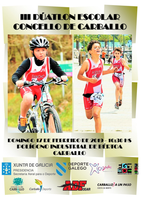Mañán as 12:15hs presentaráse na Casa do Concello o III Dúatlon Escolar de Carballo, proba clasificatoria para o Campionato Provincial da modalidade que se enmarca dentro do programa Xogade que promove a Secretaría Xeral para o Deporte da Xunta de Galicia. A este acto acudirán Roberto García (Xefe do Servizo Provincial de Deportes), Evencio Ferrero (Alcalde de Carballo), Marcos Trigo (Edil de Deportes), Gustavo Álvarez (Presidente da AD.Fogar) e Eduardo Martínez (Representante do Grupo Breogan Motor). O evento disputaráse no polígono carballés de Bértoa o vindeiro domingo día 17 de febreiro en horario de 9:30 a 14:00hs baixo a organización da Federación Galega de Tríatlon, o Concello de Carballo, Carballo Deporte e a AD.Fogar, grazas á colaboración do Grupo de Voluntariado, a Policía Local, Protección Civil, Mundocio Eventos, Ciclos Quintena e Grupo Breogán Motor. Ata a capital de Bergantiños desprazaránse 18 equipos da Provincia que mobilizarán a 290 duatletas de base, nenos e nenas de idades comprendidas entre os 9 e os 16 anos que competirán ao longo da mañá nas 6 carreiras da xornada. O regulamento da proba e a inscrición da AD.Fogar podedes atopalos como documentos anexos a esta mesma noticia. Para más información podedesvos dirixir a ligazón: http://fegatri.org/inscricion-iii-duatlon-escolar-concello-de-carballo-17-02-2019/