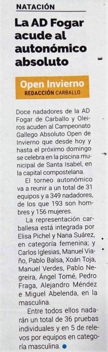 Desde mañá, venres día 28 de decembro de 2018 e ata o vindeiro domingo día 30, doce nadadores e nadadoras da AD. Fogar de Carballo e Oleiros tomarán parte no Campionato Galego Absoluto Open de Inverno que se disputa sobre 25 metros e 8 rúas na Piscina Municipal de Santa Isabel en Santiago de Compostela. O torneo autonómico contará coa presenza de 31 equipos e o concurso de 349 nadadores e nadadoras, dos que 193 son homes e 156 son mulleres. En canto á nosa representación dicir que nesta ocasión confórmana 12 deportistas, Elisa Pichel e Nana Suárez en categoría feminina e Carlos Iglesias, Manuel Viaño, Pablo Balsa, Xoan Toja, Manuel Verdes, Pablo Negreira, Ángel Tomé, Pedro Fraga, Alejandro Méndez e Miguel Abelenda na masculina; entre os que nadarán un total de 36 probas a título individual e as 5 remudas por equipos na categoría masculina. Toda a información referente a este Campionato Galego de Natación Absoluto Open de Inverno podedes atopala na ligazón federativa https://www.fegan.org/post/1748; ademais achéganse a esta noticia a nosa convocatoria, e as listaxes de saídas do campionato.