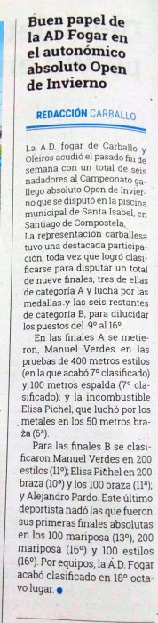 Los pasados 28, 29 y 30 de diciembre de 2017 seis nadadores de la AD.Fogar de Carballo y Oleiros tomaban parte en el Campeonato Gallego Absoluto de Natación Open de Invierno que se disputaba en sesiones de mañana (eliminatorias) y tarde (finales) en la Piscina Municipal Santa Isabel de Santiago de Compostela; lugar dónde los nuestros despedían el año con una buena actuación tras clasificarse para nadar nueve finales, tres de ellas A en la lucha por las medallas y otras seis B para dilucidar los puestos del 9º al 16º. Para nadar las finales A conseguían clasificarse, Manuel Verdes en las pruebas de 400 estilos (7º clasificado) y 100 espalda (7º clasificado) y la insombustible Elisa Pichel en los 50 braza (6ª clasidficada). Para las finales B se clasificaban Manuel Verdes en los 200 estilos (11º clasificado), Elisa Pichel en los 200 baraza (10ª clasificada) y los 100 braza (11ª clasificada) y Alejandro Pardo que nadaba sus primeras finales absolutas en los 100 mariposa (13º clasificado), los 200 mariposa (16º clasificado) y los 100 estilos (16º clasificado). Por equipos fuimos finalmente 18º de la clasificación masculina, 18º de la femenina y 18º de la conjunta, entre los 26 equipos participantes en el torneo. Los resultados de los nadadores de Carballo y Oleiros pueden consulrase en el apartado de descargas natación de esta misma web; además en el enlace federativo https://www.fegan.org/mp/default/post/1748 pueden encontrarse los detalles pormenorizados del campeonato.