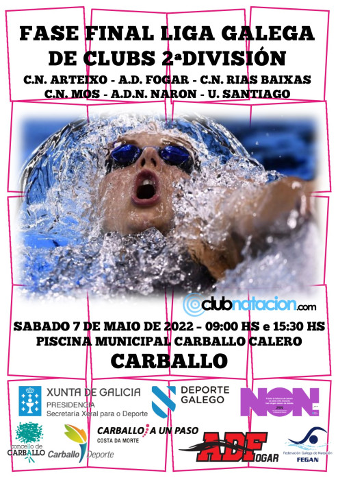 Mañá sábado día 7 de maio de 2022 a piscina municipal Carballo Calero acollerá a porta pechada e en sesións de mañán (9:30 horas) e tarde (15:30 horas), a Fase Final da Liga Galega de Clubs de Natación na súa segunda división; proba que achegará a Carballo a uns 122 nadadores, 61 mozas e 61 mozos. Como locatarios xogaremosnos o títalo e o ascenso co C.N. Arteixo, favorito para acadar o títalo, e co C.N. Vigo Rías Baixas, mentres que pola permanencia loitarán o C.N. Mos, a A.D.N. Narón e o U.S.C. Desta volta concursaremos cun equipo formado por 22 d@s nos@s nadadores-as, das que 11 pertencen á categoría feminina e outros 11; entre os que se repartirán as 40 probas da xornada, 32 individuais e 8 substitucións. O noso equipo afronta esta derradeira xornada coa firme intención de acadar unha das 2 prazas de ascenso á primeira división, pero tamén coa ilusión de loitar ata a última brazada polo títalo. No apartado de descargas natación desta mesma web podedes atopar a lista de saídas desta finalísima galega da 2ª División da Liga de Clubs.