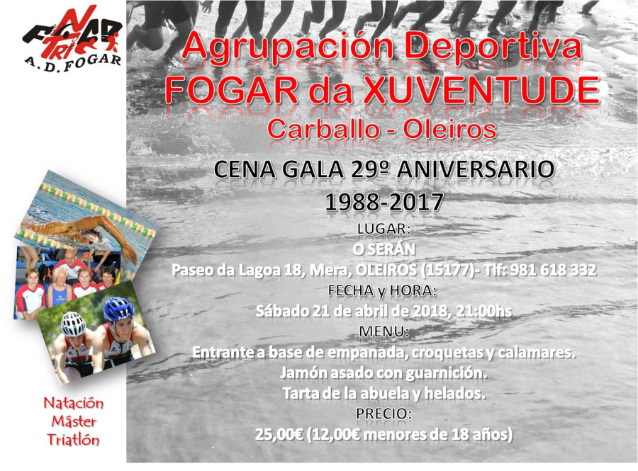 La Junta Directiva de la AD.Fogar de Carballo y Oleiros tiene el placer de invitaros a la ya tradicional Cena y Gala anual de la entidad que va ya por su 29ª edición. Gala que en esta ocasión celebraremos el próximo sábado día 21 de abril de 2018 desde las 21:00hs en el Bar O Serán de Mera, situado en el númerio 18 del Paseo da Lagoa. El precio por persona asciende a 25€ en el caso de los adultos y a 12€ en el caso de los menores de edad, importe que cada comensal abonará en la misma cena. Recordamos también a todos nuestros ex-socios, socios, familiares, amigos y colaboradores que deseen compartir esta velada tan señalada junto a los galardonados de la pasada campaña (mejores nadadores Elisa Pichel y Manuel Verdes y mejores triatletas Carlos González y ... sorpresa). El plazo de inscripción finaliza mañana, por lo que aún estáis a tiempo de confirmar vuestras reservas entre hoy y mañana solicitándolo al correo electrónico del club (info@adfogar.com). ¿ES QUE OS LO VÁIS A PERDER?
