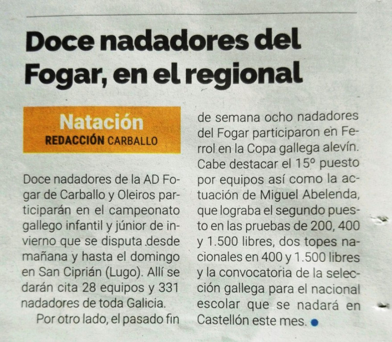 Desde el viernes día 2 de marzo de 2018 y hasta el próximo domingo día 4, doce nadadores de la AD.Fogar de Carballo y Oleiros medirán sus fuerzas en una nueva edición del Campeonato Gallego Infantil y Junior de Invierno que se disputa en la Piscina Municipal de Lieiro en San Ciprián, Cervo (50m y 8 calles). El torneo regional contará con la presencia de 26 equipos y el concurso de 331 nadadores de nuestra comunidad autónoma, 182 chicas y 189 chicos. En cuanto a nuestra representación decir que la conforman 12 nadadores que llegan en su mejor momento de forma, 4 féminas de categoría infantil y 8 varones, 7 de ellos infantiles y 1 junior, entre los que nadarán un total de 37 pruebas, 32 de ellas a título individual y otras 5 de relevos, los de los equipos infantil masculino (3) y femenino (2). En la sesión del viernes por la tarde abrirán campeonato 11 de nuestros nadadores, y lo harán en las pruebas de los 200 metros libres (Brais Fraga, David Sancho, Nicolás Queijeiro y Pedro Fraga), los 100 metros mariposa (Laura Martínez, Alejandro Méndez, Ángel Tomé y Brais Fraga) y los 200 metros estilos (Manuel Verdes); además del equipo femenino infantil que nadará el relevo 4x100 metros libres (Alba Rama, Laura Martínez, Marta González y Zoe Álvarez). En el archivo adjunto a esta noticia podéis consultar la convocatoria y el programa de pruebas de nuestros nadadores. Toda la información referente al evento podéis encontrarla en la página oficial de la Fegan accediendo a través del enlace https://www.fegan.org/post/1789.