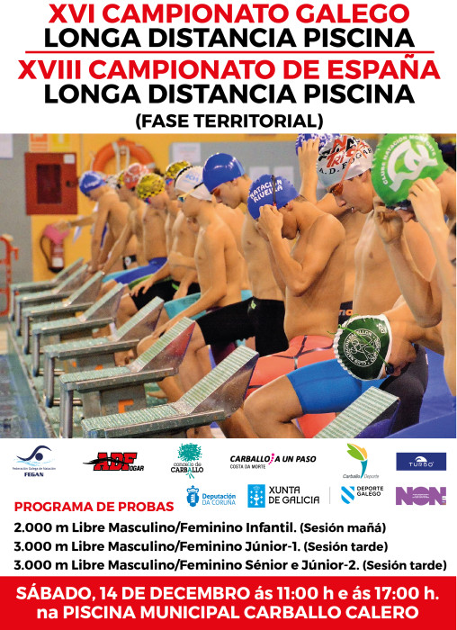 Ás 11:45 hs de hoxe preséntase na Casa do Concello de Carballo, a XVI Edición do Campionato Galego de Longa Distancia en Piscina que coincide coa fase territorial de carácter clasificatorio para o XVIII Campionato de España da modalidade, proba que se disputará o 22 de febreiro na cidade de Barcelona. Así o vindeiro sábado 14 de decembro e en sesións de mañán (11:00 horas) e tarde (17:00 horas), a Piscina Municipal Carballo Calero acollerá grazas á colaboración do Concello de Carballo, Turismo Carballo e Carballo Deporte, e baixo a organización da Fegan e a AD.Fogar; a 88 nadadores e nadadoras da nosa comunidade, 44 homes e outras 44 mulleres en representación de 18 clubs. Pola mañán nadaráse a proba dos 2.000 metros libres en categoría infantil masculina (20) e feminina (24) c@s mellores fondistas galeg@s en liza entre as que se atopan Nana Suárez (2005) e Lucía Romanelli (2006) como representantes locais. Xa pola tarde disputaranse as series dos 3.000 metros libres para as categorías júnior e senior feminina (20) e masculina (24) na que tamén teremos representación local co júnior Miguel Abelenda (2004) e o absoluto Adrián Haz (2000). Ademais da participación d@s nos@s cabe destacar tamén o concurso de nadadores e nadadoras de altísimo nivel nacional e internacional da talla de Pablo Cabana, Pablo Galán, Gaspar Andrade, Paula Otero, Carla Goyanes ou María Vilas entre outr@s. Todo o referente a este Campionato Galego de Longa Distancia en Piscina podedes consultalo na ligazón federativa https://www.fegan.org/post/1995