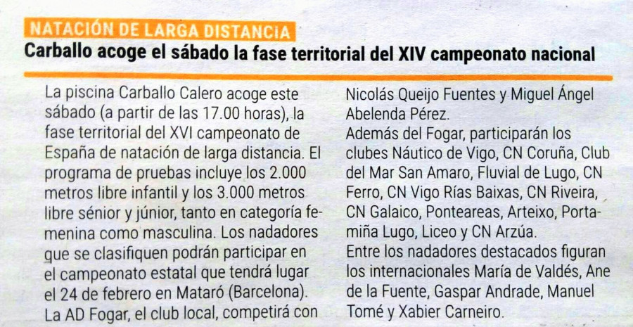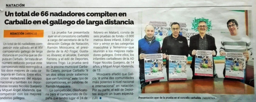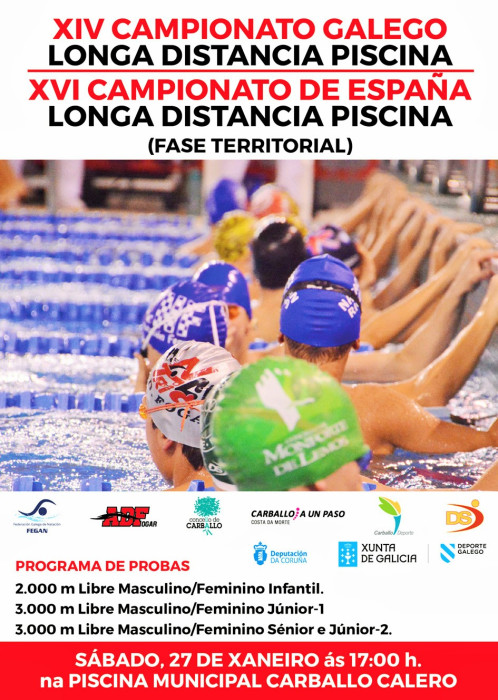 A las 17:00hs de hoy se presenta en la Casa do Concello de Carballo, la XIV Edición del Campeonato Gallego de Larga Distancia en Piscina que coincide con la fase territorial de carácter clasificatorio para el XVI Campeonato de España de la modalidad, prueba que se disputará el 24 de febrero en la localidad catalana de Mataró. Así el sábado 27 y en una única sesión de tarde, la Piscina Municipal Carballo Calero acogerá gracias a la colaboración del Concello de Carballo y Carballo Deporte y bajo la organización de la Fegan y la AD.Fogar, a 66 nadadores de nuestra comunidad, 36 en categoría masculina y 30 en la femenina en representación de 14 clubes. La jornada comenzará con la prueba de los 2.000 metros libres en categoría infantil masculina (12) y femenina (12) con los 24 mejores nadadores gallegos en liza entre los que se encuentran Nicolás Queijeiro (2003) y Miguel Abelenda (2004) como representantes locales. A continuación se disputarán las 4 series de los 3.000 metros libres para las categorías junior y senior tanto en la categoría masculina (24) como en la categoría femenina (18). Además de la participación de los nuestros cabe destacar también el concurso de nadadores de altísimo nivel como María de Valdes, Ane de la Fuente, Gaspar Andrade, Manuel Tomé o Xabier Carneiro que forman parte del Equipo Nacional de Aguas Abiertas. Todo lo referente a este Campeonato Gallego de Larga Distancia en Piscina podéis consultarlo en el enlace federativo https://www.fegan.org/post/1995