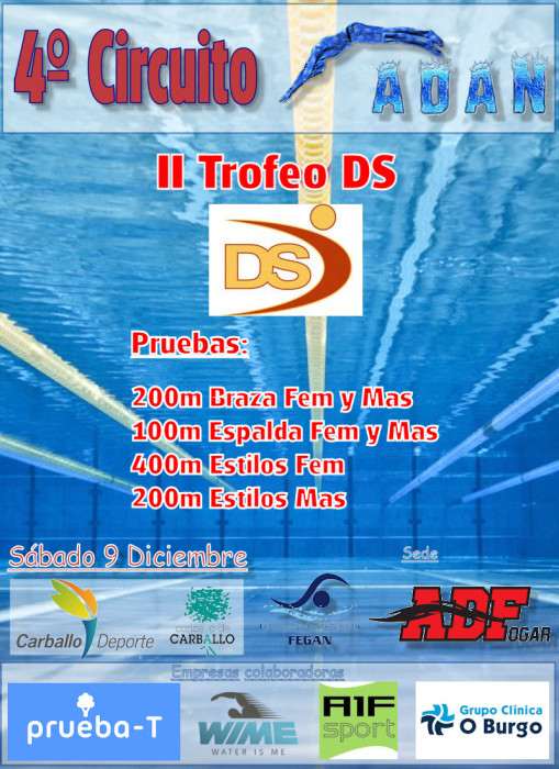 Mañana sábado día 9 de Diciembre de 2017 y desde las 15:30hs, la Piscina Municipal Carballo Calero de la Zona Bergantiños en Carballo, será sede de la 2ª Jornada del Circuíto de la Asociación ADAN que celebra ya su cuarta edición. Para la presente Campaña 2017-2018 el circuito cuenta con 4 rondas repartidas en otras tantas sedes, A Coruña, Carballo, Lugo y Vigo y está reservado a nadadores de las categorías junior y senior, aunque en cada una de las jornadas podrán acudir como invitados 2 nadadores por club de categorías inferiores, más información en http://circuito.asociacionadan.org/. En esta segunda ronda contaremos con el concurso de 6 de nuestros nadadores de los que 5 pertenecen a la categoría masculina y 1 a la femenina. Pero además de los nuestros tomarán parte en Carballo otros 15 clubes de la geografía gallega, el RCN. de Vigo (10), el CNP. Ourense (13), el CN. Coruña (8), el C. del Mar (14), el C.N. Riveira (12), el CN. Monforte (4), el CN. Ponteareas (12), el CN. Arteixo (13), el C.N. Portamiña (5), el C.N. Arzúa (8), el CN. USC (6), el CN. Galaico (8), el CN. Sanxenxo (3), el CN. Mos (7) y el CN. Vilagarcía (2) en un programa de pruebas que incluye las pruebas individuales de los 100 metros espalda, los 200 metros braza y estilos y los 400 metros estilos. El listado de salidas de la sesión y la convocatoria de los nuestros se adjuntan a esta noticia.