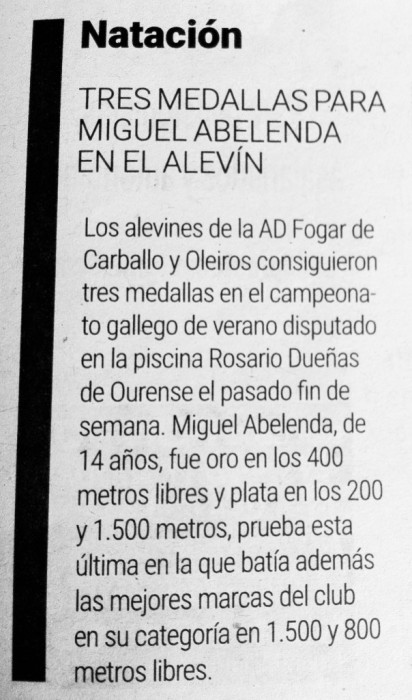 El pasado fin de semana 4 nadadores y 4 nadadoras de la AD.Fogar de Carballo y Oleiros competían en el Campeonato Gallego Alevín de Verano que se disputaba en la Piscina Rosario Dueñas de Ourense (50m y 8 calles). El torneo contaba con la presencia de 26 clubs y el concurso de 223 nadadores y nadadoras, 125 en la categoría femenina y 98 en la masculina. En cuanto a la clasificación por equipos, los del Fogar eramos 10º masculinos y 16º conjuntos, a pesar de que las niñas no conseguían sumar puntos. En cuanto a la participación individual cabe destacar las 3 medallas logradas por Miguel Abelenda de 14 años, que era oro en los 400 metros libres y plata en los 200 y 1500 metros libres, prueba esta última en la que batía además las mejores marcas del club de su categoría en 1500 y 800 metros libres. En descargas natación de esta misma web podéis consultar los resultados de nuestros jóvenes nadadores; además para ampliar la información sobre el evento os podéis dirigir también a la página oficial de la Fegan a través del enlace https://www.fegan.org/mp/post/1900.