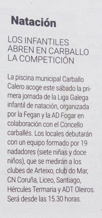 O vindeiro sábado día 27 de Outubro de 2018 a Piscina Municipal Carballo Calero en Carballo, será a sede que acolla desde as 15:30 hs a 1ª Xornada da Liga Galega Infantil de Natación baixo a organización da Fegan e a AD.Fogar en colaboración co Concello de Carballo e Carballo Deporte. A categoría infantil reúne ás nenas nadas nos anos 2004 e 2005 (13 e 14 anos) e os nenos nados en 2003 e 2004 (14 e 15 anos). Os da AD. Fogar de Carballo e Oleiros que a pasada campaña fomos 11º de 26 clubes, debutaremos nesta nova campaña cun equipo formado por 7 nadadoras e 12 nadadores, englobados no Grupo C co CN.Arteixo, Club do Mar, CN.Coruña, CN.Liceo, CN.Santiago o Hércules Termaria e a ADT.Oleiros e co obxectivo de clasificarnos entre os 10 mellores. Na xornada do sábado nadaranse as probas individuais dos 50, 200 e 1500 libres, os 100 bolboreta, os 200 costas e braza e os 100 e 400 estilos, ademais das remudas femininas e masculinas dos 4x100 estilos. Os nosos nadarán un total de 38 probas individuais (13 en categoría feminina e 25 na masculina) e 4 remudas (1 feminina e 3 masculinas). A convocatoria dos nadadores de Carballo e Oleiros e a lista de saídas desta 1ª Xornada da Liga Galega Infantil de Natación atoparédelas adxuntas a esta mesma noticia.