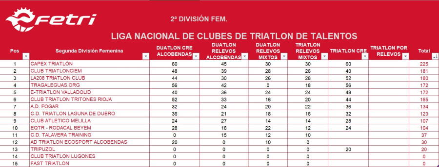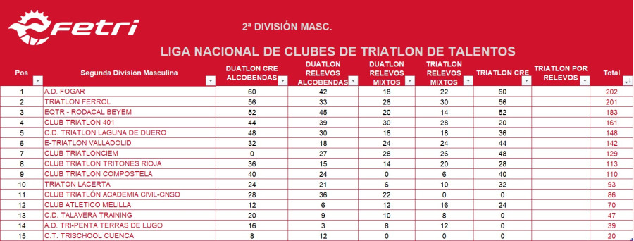Hoxe comezou na localidade almeriense de Roquetas del Mar a xornada final da Liga Nacional Talentos de Tríatlon coa disputa da contrarreloxo por equipos nas categorías masculina e feminina onde @s nos@s volveron a alternar cos mellores nun percorrido de 250 m de natación, 5,7 quilómetros de ciclismo e 1,6 quilómetros de carreira a pé. Por unha banda os rapaces que formaron con P. López, R. Otero, H. Souto, X. Guitián e A. Díaz, voban cara ao título da segunda división masculina logo de rematar 5º en 23'46'' a tan só tres segundos do caixón dos mellores, Saltoki (23'17''), Diablillos (23'41'') e Montilla (23'44'') e por detrás tamén do Fluvial de Lugo (23'45''), equipos todos eles que militan na 1ª división. Desta maneira os nosos recuperaban o liderato provisional superando nun só punto ao C.T. Ferrol. Por outra banda as rapazas con I. Alen, M. González, E. Haz e C. López eran 20ª en 30'00'' callando unha das mellores actuacións no que vai de liga e mantendo a 7ª praza nacional.