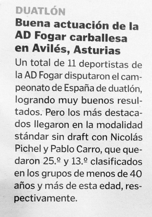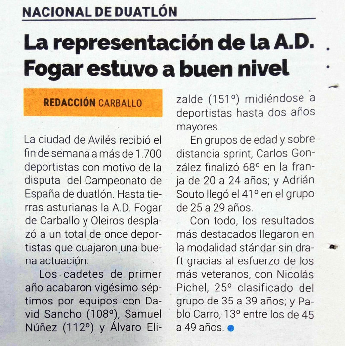 La ciudad de Avilés recibía este fin de semana a más de 1.700 deportistas con motivo de la disputa de las diferentes pruebas que conformaban el Campeonato de España de Duatlón en todas y cada una de sus categorías. Hasta tierras asturianas la AD.Fogar de Carballo y Oleiros desplazaba a un total de 11 deportistas que cuajaban una buena actuación en sus respectivas categorías. Así nuestros cadetes de primer año eran 27º por equipos con David Sancho 108º, Samuel Nuñez 112º y Álvaro Elizalde 151º de la general masculina de la categoría midiéndose a deportistas hasta dos años mayores. En grupos de edad y sobre distancia sprint, Carlos González acababa 68º entre los de 20 a 24 años y Adrián Souto terminaba el 41º de los de 25 a 29 años. Pero en esta ocasión los resultados más destacados llegaban en la modalidad stándar sin draft gracias al esfuerzo de los más veteranos, con Nicolás Pichel 25º clasificado del grupo 35 a 39 años y Pablo Carro 13º entre los de 45 a 49 años. Los resultados de los duatletas de Carballo y Oleiros pueden consultarse en el apartado de descargas triatlón de esta misma web.