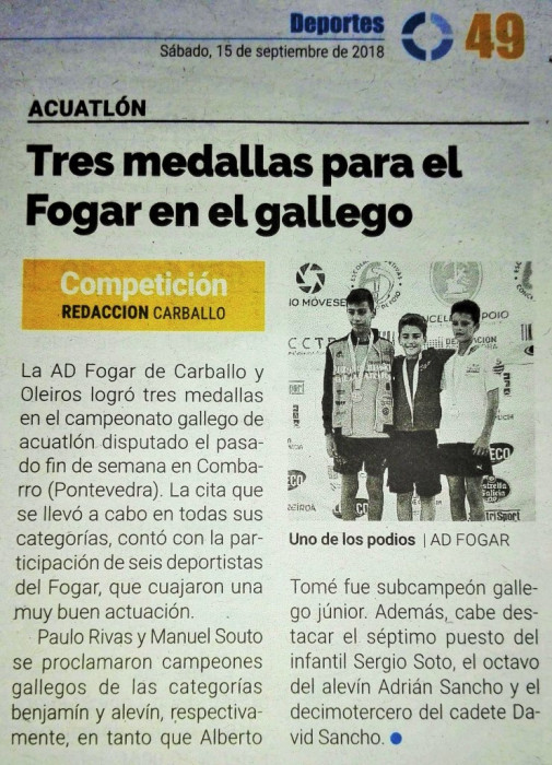 O pasado fin de semana disputábase na localidade pontevedresa de Combarro unha nova edición do Campionato Galego de Acuatlón en todas as súas categorías, proba na que tomaban parte seis dos triatletas da AD.Fogar de Carballo e Oleiros que callaban unha moi boa actuación tras facerse con tres medallas. As de Paulo Rivas e Manuel Souto como campións galegos das categorías benxamín e alevín respectivamente e a de Alberto Tomé como subcampión galego da categoría júnior. Ademais na categoría alevín Adrián Sancho era 8º, na infantil Sergio Soto terminaba 7º e na cadete David Sancho acadaba a 13ª praza. Os resultados dos nosos triatletas poden consultarse no aparatado de descargas tríatlon desta mesma web.