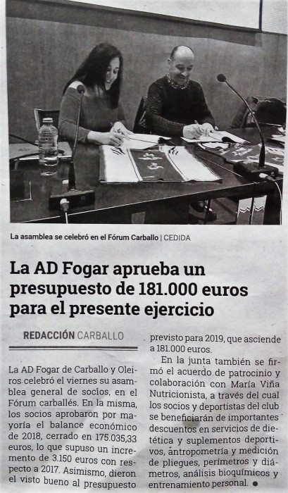 Onte venres día 5 de abril de 2019, a masa social da AD. Fogar dá Xuventude e as súas seccións de Carballo e Oleiros, reuníase no salón de actos do Fórum carballés en Asemblea Xeral Ordinaria. En 1ª convocatoria asinabase o acordo de patrocinio e colaboración con María Viña Nutricionista, a través do cal os socios e deportistas do club benefícianse de importantes descontos en servizos de dietética, nutrición e suplementación deportiva, antropometría e medición de pliegues, perímetros e diámetros, análisis bioquímicos específicos e adestramento persoal; servizos e descontos que podedes atopar como documentos adxuntos a esta mesma nova. Acto seguido en 2ª convocatoria os socios aprobaban por maioría o balance económico de 2018 pechado en 196.892,52€, 12.522,35€ máis que no pasado ano 2017; e daban tamén o seu visto bo e respaldo ao presuposto de 181.000€ presentado pola xunta directiva para o presente exercicio de 2019.
