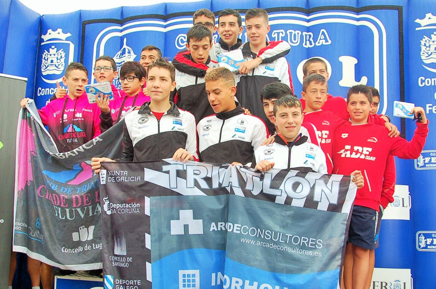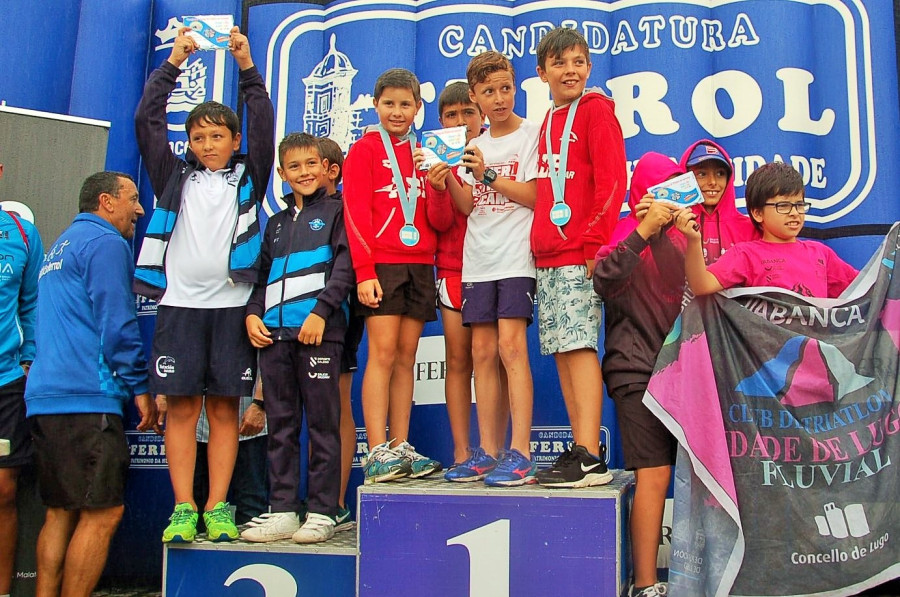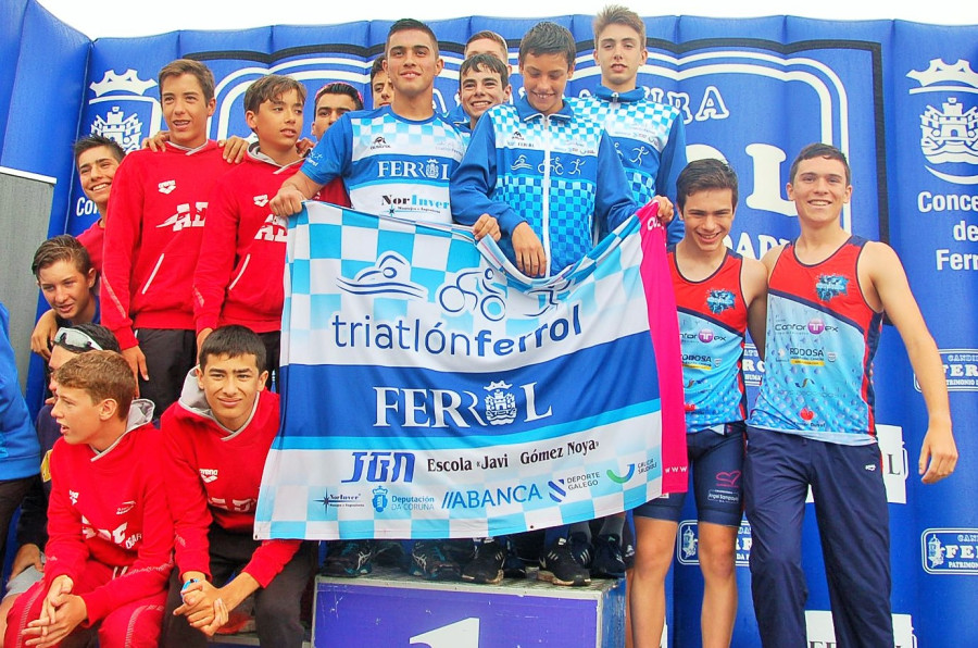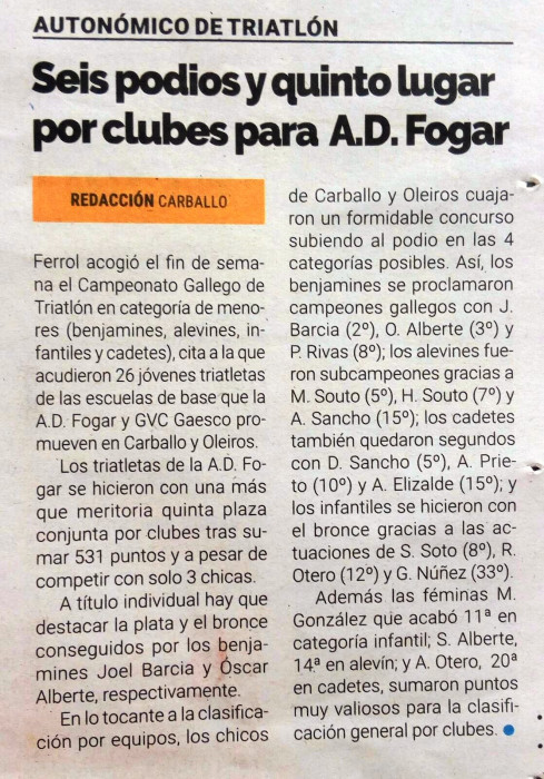 El pasado sábado día 21 de julio de 2018, la localidad de Ferrol acogía el Campeonato Gallego de Triatlón en Categoría de Menores (benjamines, alevines, infantiles y cadetes) que contaba con el concurso de 26 jóvenes triatletas de las Ecuelas de Base que la AD.Fogar y GVC Gaesco promueven en Carballo y Oleiros. En la cita autonómica nuestros jóvenes triatletas se hacían con una más que meritoria quinta plaza conjunta por clubs tras sumar 531 puntos y a pesar de competir con tan solo 3 chicas. A título individual hemos de destacar la plata y el bronce conseguidos por los benjamines Joel Barcia y Oscar Alberte respectivamente. En cuanto a la clasificación por equipos se refiere, nuestros chicos cuajaban un formidable concurso subiendo al pódium en las 4 categorías posibles, los benjamines como Campeones Gallegos con J.Barcia 2º, O.Alberte 3º y P.Rivas 8º; los alevines con M.Souto 5º, H.Souto 7º y A.Sancho 15º y los cadetes con D.Sancho 5º, A.Prieto 10º y A.Elizalde 15º como Subcampeones; y los infantiles como medallistas de bronce con S.Soto 8º, R.Otero 12º y G.Nuñez 33º. Además nuestras 3 chicas, M.González como 11ª infantil, S.Alberte como 14ª alevín y A.Otero como 20ª cadete, sumaban puntos muy valiosos para la clasificación general por clubs. Los resultados de este Campeonato Gallego de Triatlón en Categorías Menores pueden consultarse en el apartado de descargas escuela de esta misma web.