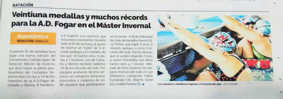 El pasado fin de semana se nadaba una nueva edición del Campeonato Gallego Open de Natación Máster de Invierno que acercaba hasta la pileta pontevedresa del Complejo Deportivo Rías Do Sur a 14 de los Maestros de la AD.Fogar de Carballo y Oleiros, 8 hombres y 6 mujeres. Los nuestros, que estuvieron excelentes durante todo el fin de semana, se traían un botín de 6 récords gallegos y 21 metales repartidos entre los miembros del equipo en 10 oros, 4 platas y 7 bronces; además los de Carballo y Oleiros batían también 14 de los récords del club. Por equipos fuimos 13º en categoría femenina, masculina y conjunta de los 28 equipos que participaban en el torneo. A título individual los más destacados fueron, Elisa Pichel que lograba 3 oros, 5 récords gallegos y otros 5 récords del club, Clarisa Alonso que se colgaba 2 Oros y Javier Fernández con otros tantos oros, 1 bronce y un récord gallego. Además de Elisa batían las mejores marcas del club en sus diferentes categorías Pablo Fernández (4), Alberto Tomé (2) e Isabel Pereira (2). Los resultados de nuestros nadadores en este Campeonato Gallego Máster de Invierno pueden consultarse en el apartado descargas máster de esta misma web. Información que podéis ampliar también en el enlace federativo https://www.fegan.org/post/963.
