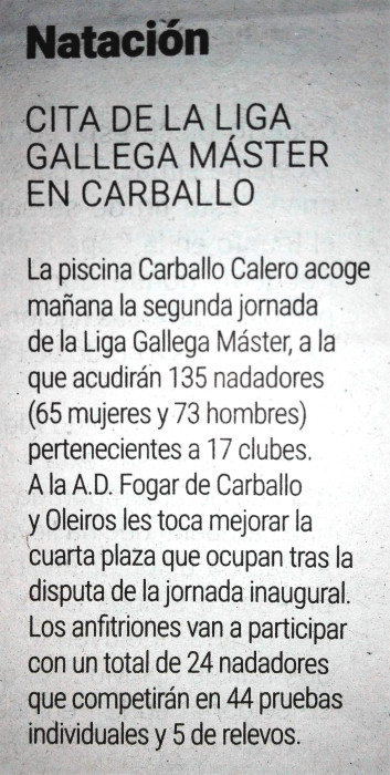Na mañá do próximo domingo día 18 de novembro de 2018, a Municipal Carballo Calero de Carballo será a pileta que acolla a segunda xornada da Liga Galega Máster de Natación grazas a colaboración do Concello de Carballo e Carballo Deporte. Á cita carballesa acudirán un total de 135 nadadores, 62 mulleres e 73 homes, dos 17 clubs galegos que tomarán parte nesta segunda rolda ligueira no seu grupo norte. Aos da AD. Fogar de Carballo e Oleiros tócanos remontar a cuarta praza que ocupamos de maneira provisional despois da xornada inaugural. E para iso poñeremos en liza a un equipo conformado por 24 nadadores, das que 6 son mulleres e os 18 restantes son homes. Os nosos mestres nadarán en Carballo un total de 44 probas a título individual e 5 de remudas, dentro dun programa que inclúe nesta 1ª cita as probas dos 50 m costas e bolboreta, os 100 m braza e os 400 m libres libres nas categorías feminina, masculina e mixta, ademais da remuda dos 4x50 m libres nas categorías feminina e masculina. Os informes de inscrición, o sumario de participantes e as listas de saídas están dispoñibles para a súa consulta como documentos adxuntos a esta mesma noticia.
