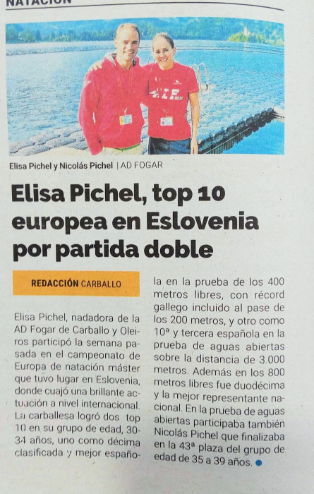 A nadadora Elisa Pichel da AD. Fogar de Carballo e Oleiros tomaba parte a semana pasada no Campionato de Europa de Natación Máster que se celebraba en Eslovenia, https:// www. emc2018. com/. Elisa callou outra brillante actuación a nivel internacional con dous top 10 no seu grupo de idade o de 30 a 34 anos, un como 10ª clasificada e mellor española na proba dos 400 metros libres, con récord galego incluído ao pase dos 200 metros e outro como 10ª e 3ª española na proba de augas abertas sobre a distancia de 3000 metros. Ademais nos 800 metros libres Elisa era 12ª e tamén a mellor representante nacional. Na proba de augas abertas participaba tamén Nicolás Pichel que finalizaba na 43ª praza do grupo de idade de 35 a 39 anos. Os resultados dos nosos mestres poden consultarse no apartado de descargas máster desta mesma web.
