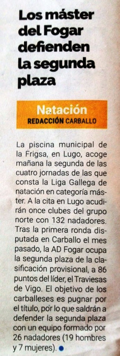 El próximo domingo día 3 de diciembre de 2017, la Piscina Municipal de la Frigsa en Lugo será la pileta que acoja la segunda de las cuatro jornadas de las que consta la Liga Gallega de Natación en su Categoría Máster. A la cita lucense acudirán 11 clubs del Grupo Norte que movilizarán a un total de 132 nadadores, de los que 60 pertenecen a la categoría femenina y otros 82 a la masculina. Tras la primera ronda celebrada el pasado mes en Carballo, los de la AD.Fogar ocupamos la segunda plaza de la clasificación provisional a 86 puntos del líder, el CN.Traviesas de Vigo. Con la árdua tarea de mantenernos en la pugna por el título, mañana pondremos en liza un equipo formado por 26 nadadores, 7 mujeres y 19 hombres que nadarán un programa de 56 pruebas a título individual y otras 6 de relevos por equipos, dentro de un programa que en esta segunda cita incluye las pruebas de los 200 metros mariposa y estilos mixtos, los 100 metros espalda y braza y los 50 metros libres masculinos y femeninos, además de los relevos de los 4x50 metros estilos masculinos y femeninos. En los archivos adjuntos a esta noticia puede consultarse toda la información referente a la jornada lucense, como el sumario de participantes, las distintas inscripciones y la lista de salidas del domingo.