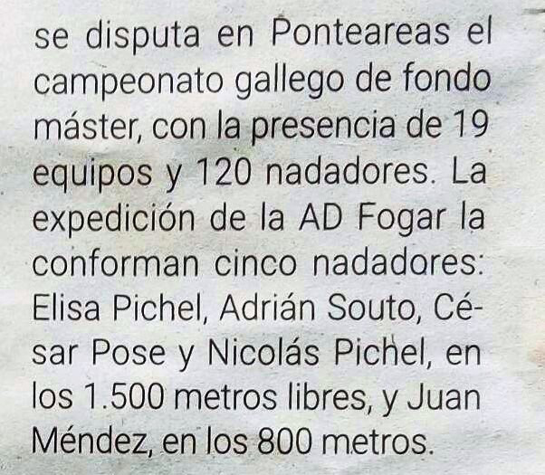 El próximo domingo día 11 de marzo de 2018 y en horario matinal, la piscina municipal del Complejo Deportivo Álvaro Pino en Ponteareas, acogerá el Campeonato Gallego de Fondo y "IX Memorial Gerardo Steudel" en la categoría Máster, prueba que contará con la presencia de 19 equipos de nuestra comunidad autónoma y el concurso de 120 nadadores, de los que 73 son hombres y otras 47 son mujeres. La expedición de los de Carballo y Oleiros la conforman 5 nadadores, Elisa Pichel, Adrián Souto, César Pose y Nicolás Pichel que nos representarán en la prueba de los 1500 metros libres y Juán Méndez, que hará lo propio en la prueba de los 800 metros libres. Cabe mencionar que Elisa Pichel de la categoría 30 a 34 años viajará a Ponteareas con un nuevo reto personal, el de rebajar el récord nacional de la distancia en piscina de 25 metros que en la actualidad posee la nadadora del Vila Real Ione Vilar, con un registro de 19.03.74 (http://www.rfen.es/publicacion/ficheros/master25.pdf). Se adjuntan a esta noticia la lista de salidas del domingo y la inscripción de nuestros maestros, además en el enlace federativo (https://www.fegan.org/mp/default/post/351) podéis consultar todos los detalles referentes al evento encuestión.