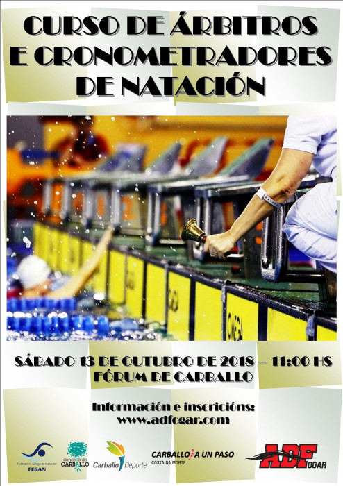 A Federación Galega de Natación e o seu Comité Galego de Árbitros, organizarán en Carballo un Curso de Árbitros e Cronometradores en colaboración co Concello de Carballo, Carballo Deporte e a Agrupación Deportiva Fogar da Xuventude. O curso celebrarase o sábado día 13 de outubro do 2018 nas instalacións do FÓRUM desde as 11:00 horas. O prezo do mesmo é de 20 euros e inclúe o custo do curso e a licenza federativa, importe a abonar o mesmo día do curso; diñeiro que se recupera nunha soa competición xa que a Federación Galega de Natación paga un mínimo de 20 euros por unha sesión de dúas horas e media. O único requisito esixido aos posibles interesados é ter cumpridos os 16 anos e presentarse cunha copia do seu DNI. As inscricións poden formalizarse na sección de contactos desta mesma web indicando o nome e apelidos, o correo electrónico e deixando constancia como Inscrición Curso Árbitros 2018.