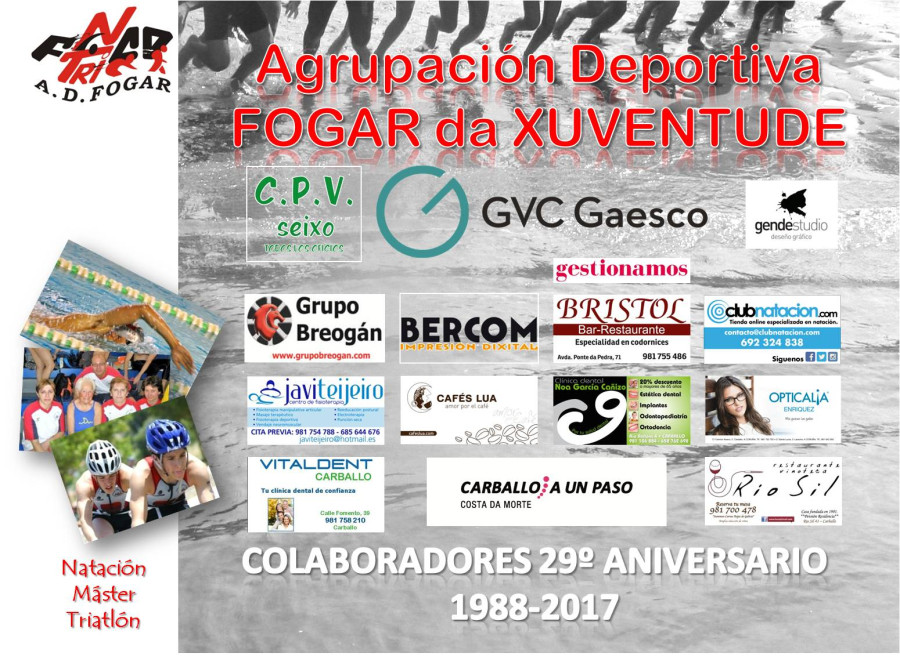 La Junta Directiva de la AD.Fogar de Carballo y Oleiros tiene el placer de invitaros a la ya tradicional Cena y Gala anual de la entidad que va ya por su 29ª edición. Gala que en esta ocasión celebraremos el próximo sábado día 21 de abril de 2018 desde las 21:00hs en el Bar O Serán de Mera, situado en el númerio 18 del Paseo da Lagoa. El precio por persona asciende a 25€ en el caso de los adultos y a 12€ en el caso de los menores de edad, importe que cada comensal abonará en la misma cena. Recordamos también a todos nuestros ex-socios, socios, familiares, amigos y colaboradores que deseen compartir esta velada tan señalada junto a los galardonados de la pasada campaña (mejores nadadores Elisa Pichel y Manuel Verdes y mejores triatletas Carlos González y ... sorpresa). El plazo de inscripción finaliza mañana, por lo que aún estáis a tiempo de confirmar vuestras reservas entre hoy y mañana solicitándolo al correo electrónico del club (info@adfogar.com). ¿ES QUE OS LO VÁIS A PERDER?