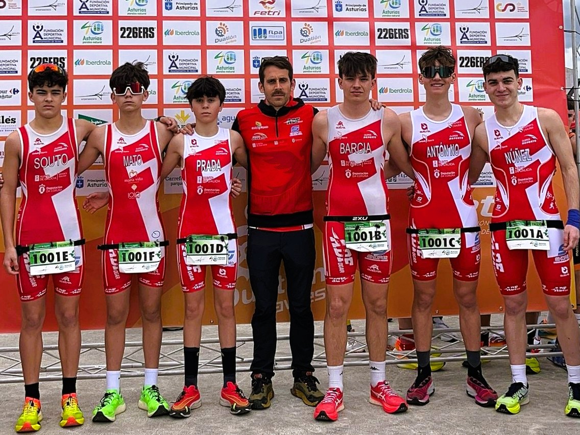 A primeira das citas puntuables da Liga Talento, onde estamos a militar por cuarto ano consecutivo na 1ª División Nacional Masculina e logo do terceiro posto de 2024; tivo lugar a pasada fin de semana na localidade de Avilés con 6 dos nosos en liza. Nesta primeira parada asturiana disputáronse os Campionatos de España de Dúatlon Contrarreloxo e Remudas por equipos na que os da A.D.Fogar de Carballo e Oleiros tomamos parte con 4 triatletas da categoría xuvenil e outros 2 cadetes de primeiro ano co obxectivo inicial de manternos na categoría. Na mañá do sábado Antón No, Joel Barcia, Lucas Prada, Michel Núñez, Diego Souto e Nicolás Mato remataron a cotrarreloxo por equipos nunha prometedora 10ª praza. O domingo tamén á mañá, Lucas, Joel e Michel correron a Remuda na que foron 14º na categoría Elite, mentres que na categoría Open, reservada aos segundos equipos, Nicolás, Diego e Antón remataron 12º. Á espera de que a FETRI publique a clasificación provisional desta 1ª División Nacional que conformamos 25 equipos, podedes consultar os resultados desta fin de semana no apartado de descargas tríatlon de esta mesma web.