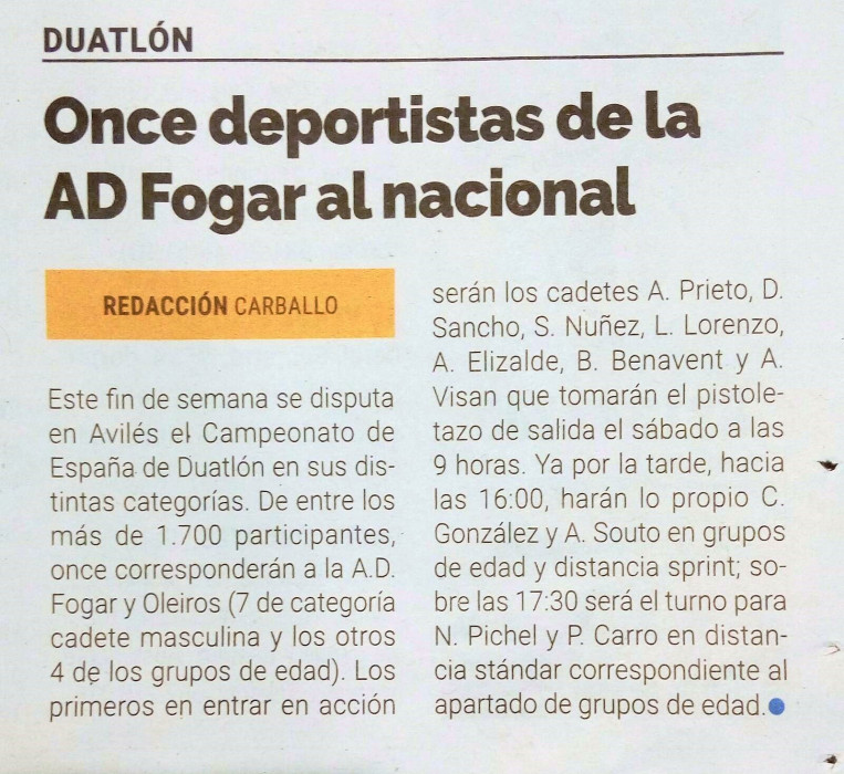La ciudad de Avilés se prepara para recibir los días 7 y 8 de abril de 2018 a más de 1.700 deportistas con motivo de la disputa de las diferentes pruebas que conforman el Campeonato de España de Duatlón 2018 en todas sus categorías. Y hasta tierras asturianas se desplazarán 11 de nuestros deportistas, de los que 7 pertenecen a la categoría cadete masculina y otros 4 a la de Grupos de Edad. Los primeros en entrar en acción serán los cadetes A.Prieto, D.Sancho, S.Nuñez, L.Lorenzo, A.Elizalde, B.Benavent y A.Visan que tomarán el pistoletazo de salida el sábado a las 9:00hs. Ya por la tarde hacia las 16:00hs harán lo propio C.González y A.Souto en Grupos de Edad y Distancia Sprint y sobre las 17:30hs N.Pichel y P.Carro nos representarán también en Grupos de Edad pero sobre Distancia Stándar. Toda la información de estos Nacionalesde Duatlón 2018 puede consultarse en la página de la Federación Española de Triatlón a través del enlace: https://bit.ly/2mO5uTj