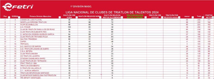 Despois de acadar en Soria o subcampionato nacional de dúatlon na contrarreloxo por equipos, e sumar unha meritoria sexta praza na substitución de dúatlon; o noso equipo masculino remontou nove posicións na segunda xornada da 1ª División Nacional da Liga Talento de Tríatlon. A vindeira parada para seis dos nosos será esta fin de semana en Águilas con motivo da disputa dos nacionais de tríatlon contra o reloxo por equipos e substitucións por equipos. Adrián Sancho, Hugo Souto, Iago Prada, Joel Barcia, Michel Núñez e Oscar Alberte conforman o equipo de Carballo e Oleiros nesta terceira e penúltima xornada da Liga Talento na que estamos a ocupar a cuarta praza empatados a 163 puntos co Diablillos, a 1 só punto do Córdoba que ten 164 e a 8 puntos do Fluvial que suma 171 dun total de 25 clubs.