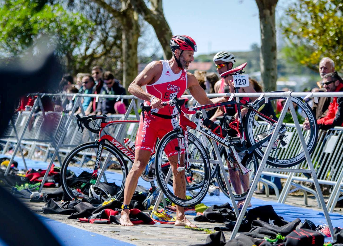 El pasado domingo 8 de mayo la localidad pontevedresa de Sanxenxo acogía el Campeonato Gallego de Triatlón sobre Media Distancia (1,9k a nado, 90k de ciclismo y 21k de carrera a pie) que se desarrollaba bajo unas condiciones meteorológicas bastante adversas que mismo hacían retrasar el momento de la salida por el estado del mar; condiciones que en ningún momento conseguían empañar el buen hacer de nuestros dos representantes, Pablo Carro y Nicolás Pichel. En lo que respecta a Pablo, lograba acabar la prueba como 12º de la general absoluta, lo que le alzaba además con la medalla de bronce de su categoría, la de Veteranos 1 y lo hacía en 4h:51'55'', saliendo del agua el 10º en 27', rodando durante el tramo ciclista a 31k/h en 2h52' y finalizando el segmento de carrera con el 6º mejor parcial del torneo volando a ritmo de 4'05''en 1h26'. Por su parte Nicolás salía el 35º del agua en 32', rodaba también en 2h52' a 31k/h de media y corría en 1h31' a 4'21'' el kilómetro, completando la prueba en 5h:04'14'' como 19º absoluto. Carrerón por tanto de los 2 representantes de la AD.Fogar - GVC Gaesco en este Campeonato Gallego de Media Distancia de Sanxenxo, resultados que pueden consultarse en el apartado descargas triatlón de esta misma web.